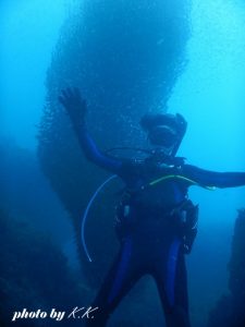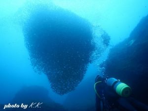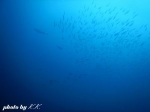2本目の南部出しでワイドなダイビング。向こうから黒い塊がやってきたと思ってよくよく見るとなんとキンメモドキの群れ。かなりの大きさに全員ビックリです。この大きさと密度、写真で少しでも伝わるでしょうか。これは実物をぜひ見て欲しいです!
