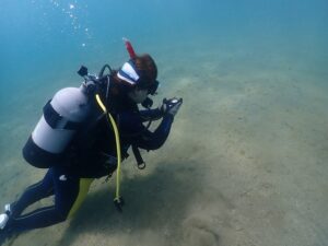 9月になったとはいえ海はまだまだ夏の暑さが続いています。汗をかきながら器材を背負って歩いて、いざ海へ。海に入るとちょうどいい冷たさが気持ちよかったです!