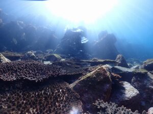午後からは光が差し込んでこんな幻想的な光景も。ずっと見てられました。アオリイカの編隊も見られましたよ。