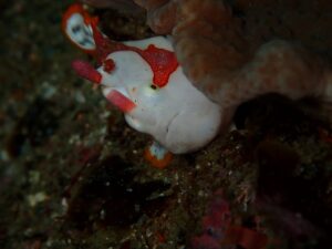 串本では先日アオリイカの産卵床を設置したところだそうで見に行ったのですが、残念ながらまだ卵は海つけられてないようでした・・・でも2ダイブともアザハタに出会えてしっかり写真も撮っていただけました。その他にもテングダイやホウライヒメジの群れなどワイド三昧で楽しめました。その合間にカエルアンコウやウミウシなどのマクロもしっかり楽しめましたよ♪