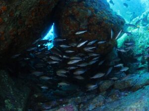 お天気も良く海も穏やか。絶好のダイビング日和です!1本目は洞窟ポイントの小島東へ。洞窟の中から外へ向かって撮影すると幻想的な写真が撮れました。いろいろ試してみましたが面白い写真が撮れましたよ♪休憩時間もスノーケリングしながら水面で写真を撮って遊べました。