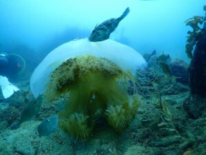 それから流れ流れて最後は力尽きて沈んでしまったエチゼンクラゲがあちこちに。カワハギなどにかじられて食べられてしまった姿が哀愁を誘います・・・