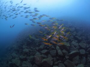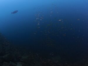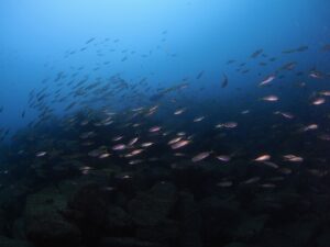 今の時期は透明度はまだ低めですが敷石エリアの魚群はすごい迫力でした。アジやイサキ、タカベなどが見られたり小魚をカンパチなどの大型魚が狙うところも見られました。