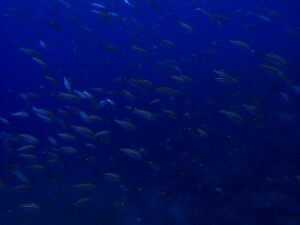 エントリーした途端たくさんのマツバスズメダイの群れが!ほかにもアジやイサキなどたくさんの魚が群れていました。そしてそれを追いかけるハマチ、大迫力のシーンが見られました。